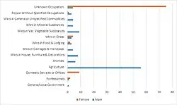 The occupational structure of Eyke in 1881, the graph shows us the number of occupational roles filled by both the male and female inhabitants in 1881. The first notable differences the data suggests is the number of females in domestic services which is 9 compared to zero for men. This is as expected as during this period women tended to be employed to care for the children and look after the general upkeep of a household, either by being employed as a maid, servant or similar occupation. If you compare this number 9 to the total female population in 1881 "179" you could assume the general houses of Eyke were not that large, as the majority of households did not have the need to employ persons in the domestic services.