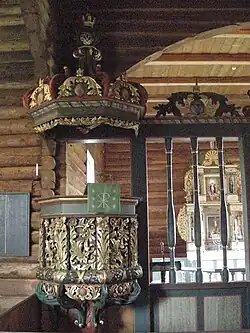 In 1748, the church received exterior paneling, it was painted reddish brown with white window frames, and the roof was tarred. In 1810, a painting by the Fåberg artist Ole Larsen Smerud was gifted to the church. It is a painting of Jesus on the cross and it was hung above the altar in the church. Smerud studied painting in Copenhagen, where he worked as a court painter and heraldic artist.[7][8][4][6]