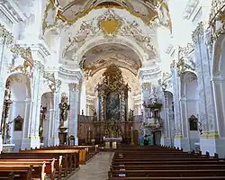 The interior follows the pattern of a pilaster church. The high altar, completed in 1741, is by Johann Baptist Straub,[8] the side altars from 1720 to 1730 by Joseph Matthias Götz.[9] The stucco work was created by Johann Baptist Modler, the frescoes and the high altar painting of the Assumption of the Virgin Mary as well as other altarpieces by Johann Jakob Zeiller.[10]