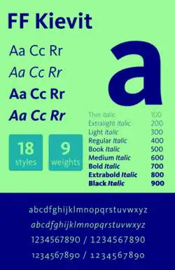 FF Kievit is a humanist sans-serif typeface designed by Mike Abbink, Christian Schwartz and Paul van dan Laan, published by FontShop International, and released in 2001. It currently has 18 styles, including 9 weights and true italics, as well as small caps and text figures. It is described as being "ideal for large projects in print and on screen."[1]