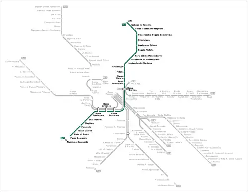 The route operates over the infrastructure of the Florence–Rome railway, the Pisa–Livorno–Rome railway and the Rome–Fiumicino railway.[2] Within the territory of the comune of Rome, it plays the role of a commuter railway. It is estimated that on average about 65,000 passengers travel on an FL1 train each day.