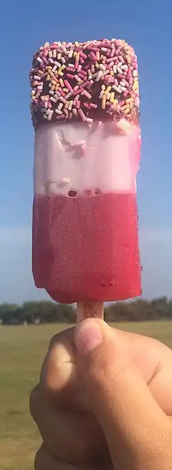 The lolly consists of strawberry fruit ice and cream with the top portion dipped in chocolate and coated with hundreds and thousands.