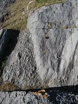 Deformed waterlain volcanic sediments. Primary fabric (bedding) shown by abrupt change in clast size, secondary fabric shown by penetrative S-fabric, cleavage, in fine-grained rock, and by shape fabric in deformed volcanic clasts. Cape Forchu, Nova Scotia