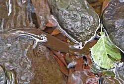 The freshwater marsh was formed by massive land movement along the Rodgers Creek Fault. The two ponds on the property are manmade, having been created in the early 20th century. These wetland communities are important habitat for many species including sora and Virginia rails, western pond turtles, and the federally listed endangered Red-legged Frog. Moreover, natural seeps feed these locations and the outcome is climax vegetation that has stabilized. Turtle Pond has a layer of duckweed on the water surface that is consumed by a variety of fauna. Riparian zones of Copeland Creek have a very high percentage population of California bay laurel, but also provide habitat for a rich variety of amphibians, newts and other fauna. The Pacific giant salamander, one of the largest known species of salamander is observed hunting for prey in Copeland Creek. Other amphibians seen in riparian habitats include the Pacific treefrog, Hyla regilla, Rough skinned newt, Taricha granulosa, and California slender salamander, Batrachoseps attenuatus. A number of plants are particular to the deeply shaded riparian zone including snowberry and the uncommon California ginseng, Aralia californica.