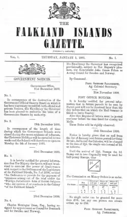 The Falkland Islands Gazette is the government gazette of the Falkland Islands Government. It has been published in Stanley since 1891.[1]