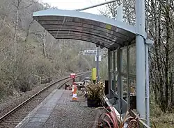 The station has no facilities bar an electronic display and a bench. There is no car park or drop-off point, as the only entrance is directly off the A85. The station does not have step-free access.[9] As there are no facilities to purchase tickets, passengers must buy one in advance, or from the guard on the train. As the station does not have lighting, trains cannot call between dusk and dawn.