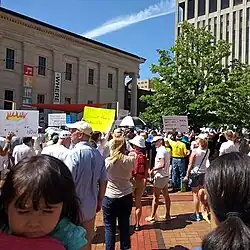At some of the locations there were counter protesters, resulting in at least one arrest. A counter-protester was arrested at Huntsville, Alabama after displaying a gun, and reportedly stating "I will shoot everyone here."[18] In Phoenix, Arizona, about 25 counter-protesters from patriot movement proclaimed their opposition to the protests using signs and a megaphone, and engaging others at the protests near Arizona State Capitol, while the event remained mostly peaceful.[19]