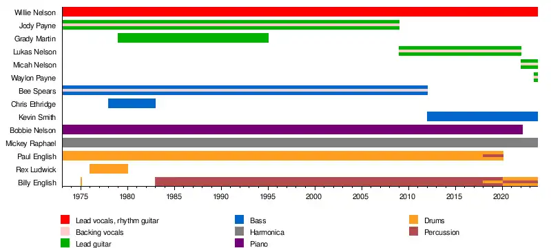 In 1973, he formed a new backing band. The new lineup consisted of some of the members of his old road band "The Record Men," with the addition of new members. The original lineup included his sister, Bobbie, on the piano; drummer Paul English; harmonicist Mickey Raphael; bassist Bee Spears; and guitarist Jody Payne. The current lineup includes all the members but Jody Payne, who retired in 2008, Bee Spears, who died in 2011, and Paul English, who died in February 2020. Billy English joined in 1983 on percussion.[1] Replacing Spears, Kevin Smith joined the band in 2012, and Willie Nelson’s son Lukas Nelson joined in 2013 replacing Payne. Bobbie Nelson died in 2022. Willie's son Micah replaced his brother Lukas in 2022, and Waylon Payne (Jody Payne's son) has filled in for Micah at some 2023 shows.