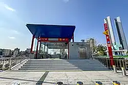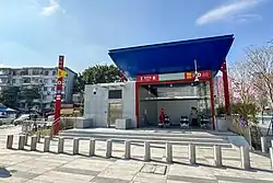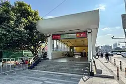 In 2010, Exit A2 had to be renovated with escalators and the installation of a "flying roof" canopy, so the exit was temporarily closed during the renovation period.[6] In addition, the station used to have Exits C and D at the time of its opening, but now they have been closed due to the construction of Line 22 station and Exit C has been demolished.[7] Exit B2 was also closed due to construction of Line 11 since 9 March 2021 and subsequently demolished. After the Line 11 station opened, three new exits on both sides of Fangcun Avenue were added, which were lettered as C, D and E respectively, of which the new Exit C is located next to Exit A1, and Exit E is newly built at the original place of Exit B2.