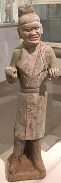 Fanlingpao (Chinese: 翻领袍; pinyin: fānlǐngpáo; lit. 'Lapel robe'), sometimes referred to as kuapao (Chinese: 袴袍) and hufu (Chinese: 胡服) in the Tang dynasty when they feature double overturned lapels, is a type of paofu with lapels. It was categorized as Hufu instead of Hanfu due to its association with clothing of the foreigners who came from the Silk road.[1] Fanlingpao were first introduced in China during the Northern Wei dynasty and became popular in Northern Qi.[2] The custom of wearing fanlingpao were then inherited and further developed in the Sui and Tang dynasties.[2] The fanlingpao could be transformed into a round collar robe, called yuanlingpao, in the Tang dynasty through the use of buttons.[2] The fanlingpao shows foreign influences, which are mostly likely from the Persian, Sassanian Persian, Iranian Sogdian,[3][2] and Turkic.[4][note 1] Fanlingpao were popular fashion during Tang dynasty for both men and women[1] and showed the popularity of Hufu-style clothing during this period; it was considered hufu while yuanlingpao was categorized as a form Hanfu.[5]