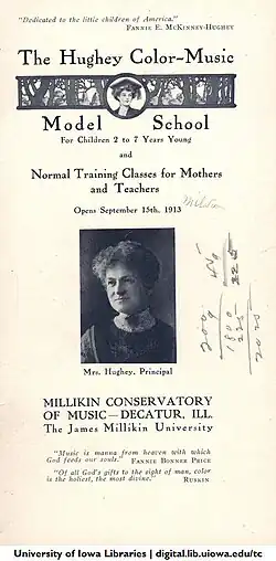 Hughey conducted The Hughey Color-Music Model School for children from two to seven years of age, and normal training classes for mothers and teachers at the Milliken Conservatory of Music, Decatur, Illinois. Along with the musical training went instruction in number work, nature work, bodily exercise, and for the more advanced pupils languages were taught. The training school was for those who wish to learn the Hughey system, either for teaching or for home instruction. [1] [2]
