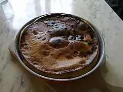 Far Breton (also Breton far; Breton: Farz forn) is a traditional cake or dessert from the Brittany region in France.[1] Its base is similar in composition to a clafoutis batter: a flan-style eggs-and-milk custard with flour added. Prunes or raisins are common additions.[2][3] Numerous recipes available at popular websites suggest soaking the dried fruits in alcohol; although this is not traditional practice.