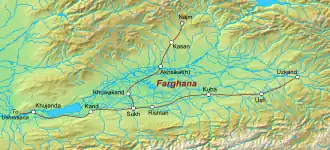 Farghana was a frontier province bordering the lands of Islam during the Umayyad and early Abbasid caliphates. Occupying the entire valley to the east of Khujand, it was surrounded to the north, east and south by mountains, with the Syr Darya running through it. The capital of the region was for some time at Kasan in the north; by the Islamic period, however, it had moved to the city of Akhsikath on the bank of the Syr Darya.[1]