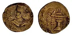 Neither Adur-Sasan nor Tirdat is known to have ruled, which implies that Farn-Sasan was seemingly from a cadet branch of the dynasty.[4] On the obverse of his coins, he is portrayed with a cap. On the reverse, a fire altar is depicted, with an inscription circled around it.[7] Farn-Sasan is the only king known to show a fire altar on coins originating from Sakastan. Around the same time, another king issued coins with a similar fire-altar depicted on it, which was the Sasanian ruler Ardashir I (r. 224–242), who around the same time was extending his domains into the east.[8] It is uncertain if Farn-Sasan copied the iconography of Ardashir I's reverse coins, or vice versa.[6] The resemblance of the coinage of Farn-Sasan and the Sasanian Ardashir I, including the shared name Sasan—a name popular in the Indo-Parthian realm—suggests that the Sasanians and Indo-Parthians possibly shared a common ancestry.[9][1] Modern historians regard them as rivals and claimants to the title of King of Kings.[10] The Iranologist Khodadad Rezakhani argues that Farn-Sasan was a superior of Ardashir I, and that the latter was only able to declare himself Kings of Kings after he defeated Farn-Sasan in 226, which marked the end of Indo-Parthian rule.[11][12]