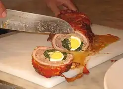 Farsu magru is prepared with beef or veal slices that are flattened and superimposed to form a large rectangle.[6] On top of this is a layer of thin bacon slices. For the filling, crushed bread slices, cubed cheese and ham, chopped onions, garlic, and fresh herbs are mixed together.[1][7][6] Subsequently, the filling is evenly distributed, and hard boiled eggs are laid in the middle.[1] The meat is then rolled around the eggs, tied together and cooked in an oven.[1] The dish can also be cooked by poaching.[2][6] It is topped with tomato sauce or tomato purée.[1]