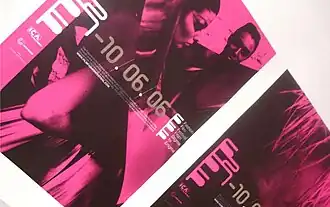 The first Fashion in Film Festival was titled Between Stigma and Enigma and premiered in London in May 2006 at the Ciné lumière, the Horse Hospital and the Institute of Contemporary Arts. The programme subsequently toured to Kino Světozor in Prague and the Museum of the Moving Image in New York.[1] The poster for the festival's visit to Prague was designed by Petr Babak; its bold colours and black hats suggest early films and later developments.[2]