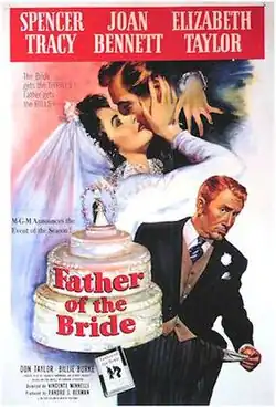 Father of the Bride is a 1950 American romantic comedy film directed by Vincente Minnelli[3] from a screenplay by Frances Goodrich and Albert Hackett, based on the 1949 novel of the same name by Edward Streeter. The film stars Spencer Tracy, Joan Bennett, and Elizabeth Taylor, and follows a man trying to cope with preparations for his daughter's wedding.[4] Father of the Bride was nominated for Academy Awards for Best Picture, Best Writing, Screenplay, and Best Actor in a Leading Role (for Tracy).