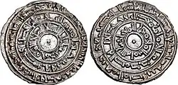 Al-Mansur's son, al-Mu'izz (r. 953–975), further changed the design of the coins: the horizontal field was removed altogether, and the coins featured thee concentric circles around a central point.[13][28] The historian Irene Bierman interprets this design as an Isma'ili motif symbolizing the centrality of the Fatimid imam–caliph, drawing on the frequent use of circles as metaphors in Isma'ili doctrine, and the circular city of Mansuriya that al-Mansur had erected, where the caliphal palace was located in its centre.[29] Others, like Jonathan Bloom, warn on the other hand that "no sources provide the slightest hint about what significance, if any, these changes were meant to have".[30] While their number varied, and the dot was sometimes removed in favour of a central, horizontally inscribed field, the three concentric circles on obverse and reverse remained as the standard pattern for subsequent Fatimid dinars until the end of the dynasty.[13][31]