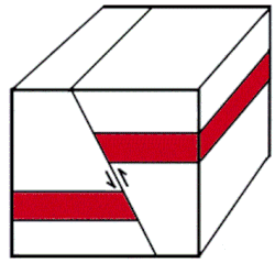 Slip is defined as the relative movement of geological features present on either side of a fault plane. A fault's sense of slip is defined as the relative motion of the rock on each side of the fault concerning the other side.[10] In measuring the horizontal or vertical separation, the throw of the fault is the vertical component of the separation and the heave of the fault is the horizontal component, as in "Throw up and heave out".[11] The vector of slip can be qualitatively assessed by studying any drag folding of strata, which may be visible on either side of the fault.[12] Drag folding is a zone of folding close to a fault that likely arises from frictional resistance to movement on the fault.[13] The direction and magnitude of heave and throw can be measured only by finding common intersection points on either side of the fault (called a piercing point). In practice, it is usually only possible to find the slip direction of faults, and an approximation of the heave and throw vector.