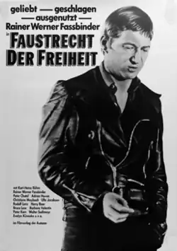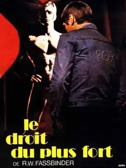 Fox and His Friends (German: Faustrecht der Freiheit, lit. 'Freedom's Law of the Jungle'; also known as Fist-Right of Freedom[1]) is a 1975 West German drama film written and directed by Rainer Werner Fassbinder, starring Fassbinder, Peter Chatel and Karlheinz Böhm. The plot follows the misadventures of a working-class gay man who wins the lottery, then falls in love with the elegant son of an industrialist. His lover tries to mold him into a gilt-edged mirror of upper-class values, and ultimately swindles the easily flattered "Fox" out of his fortune. The film is an incisive look at the relationship between money and emotions.[2] Love is seen as a commodity that can be bought for money and lasts only as long as it is profitable.[2]