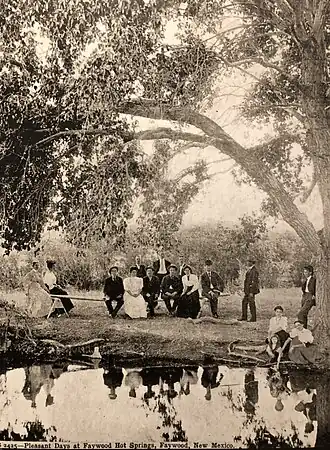 By 1900, it was developed by three men: J.C. Fay, William Lockwood, and T.C. McDermott. Fay and Lockwood's names were combined to create the "Faywood" name. McDermott was the only partner to remain at the resort.[1] The Faywood Hot Springs Hotel, which could serve up to 125 guests, was one-storied, with a three-sided courtyard and an almost 900 feet (270 m) long veranda.[7][4] The hotel had a large dining room, parlors, a writing room, barber shop, gun room, and a billiard room. Spring water was cooled and piped into the hotel rooms and bath houses.[4] Guest rooms had outdoor entrances and large windows, hot and cold water, and many rooms could be heated by piped water from the thermal springs.[7][4] In 1904, in a report by the Governor of New Mexico to the Secretary of the Interior, Faywood was identified as one of the more popular hot springs sites with "excellent hotel accommodations."[9] McDermott lived on the property until 1947, when he died at the age of 97. The resort was popular during World War I, but patronage later declined. In 1952, the hotel was demolished,[1] except for the adobe foundation.[7]