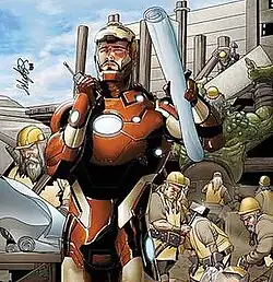 The Invincible Iron Man follows Iron Man as he travels to Paris to confront Grey Gargoyle who, as Mokk: Breaker of Faith, has turned the populace to stone.[42] After Iron Man's rival Detroit Steel meets with the same fate, and Iron Man's armor and energy supply are compromised,[43] Tony Stark uses Odin's Workshops of Svartalfheim to make weapons to fight the Worthy, as pro-Serpent forces conspire against him.[44][45][46] In Paris, Rescue comes into conflict with Sasha Hammer and her team of Steelmechs, but both are confronted by Mokk as well.[44] Mokk leaves Paris, however, when the Serpent summons his Worthy to join him at the portal to Asgard in Broxton, while Iron Man returns to Earth with the Asgardian weapons.[47]