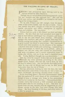 "Fedora" was written in 1895, but the story was rejected from the Atlantic Monthly because an editor felt it had "scarcely any story at all".[1] The story was published in the St. Louis magazine The Criterion under the pen name "La Tour", although it is unknown why Chopin chose this pen name. The pseudonym was likely not intended to mask her identity, and she intended to include the story in her next story collection.[2] Chopin biographer Emily Toth argued that Chopin probably knew of lesbianism through medical sexologists Richard Von Krafft-Ebing and Havelock Ellis and her close friendship with Helen, a schoolmate.[3] Toth hypothesized that the story may have been based on an admirer of Chopin's son, Jean, kissing her daughter, Lélia, and she noted similarities between Fedora and St. Louis journalist Florence Hayward.[4]