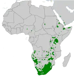 Many taxa assigned to Felicia occur in fynbos and in the Karoo. Some are sand dune specialists, such as F. amelloides and F. amoena, while others prefer to grow on rocky substrate, like F. petiolata and others in the section Neodetris. The East African annuals can be found in Miombo woodland, while a few, such as F. uliginosa, strongly associate with wet habitats. Further taxa exemplified by F. muricata subsp. cinerascens and the annuals of Namibia are very drought resistant. The taxon density of Felicia reduces from the south-west to the north-east.[2]