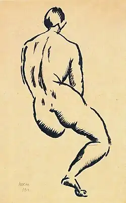 In 1913, Harta exhibited in the 43rd exhibition of the Vienna Secession, and in March in the Exhibition of the Bund Österreichischer Künstler and the Collected Works Gustav Klimt at the Művészház[4] in Budapest.[1] That summer, he traveled to Paris with his friend, the painter, Albert Paris von Gütersloh. In Paris, Harta became acquainted with Futurist painters like Marinetti, Boccioni, and Severini. He visited the painters such as Maurice Utrillo and his mother, Suzanne Valadon, and also met Auguste Rodin and the poet Rainer Maria Rilke.[1] In November and December, along with Erwin Lang and Bertold Löffler, they organized The International Black and White Exhibition in Vienna. In the exhibition catalog, Gütersloh wrote an essay on Harta’s “Street Scene from Montparnasse”. He wrote how Harta excluded everything that could evoke ideas from the beholder, and in great detail explained how the drawing evokes imaginative movement, and how Harta's drawings are "physiognomy".[5]