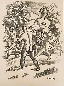 Harta was also a driving force in support of leading Austrian Expressionist Dancers. In January of 1933, he shows numerous watercolors at the International Graphics Exhibition, "The Dance, Gothic to the Present". In 1934, he served on The Prominent Jury of the International Dance Competition and Folk Dance, Vienna.[23][22] Despite the German occupation in 1938, Harta allows the well-known expressionist dancer, Hilde Holger to have dance lessons and secret performances in his studio.[24]