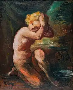 He already had cultivated such societies in Munich, Paris, and Vienna.[14] He carried on a robust letter exchange with his friend, and artist-colleague, Anton Faistauer, who argued against founding a new artistic association.[15] Harta however persists, and a letter from Faistauer dated Jan. 9th 1919 confirms that the initiative to found the new artistic association derives from Harta.[15] The new rebellious association was called “Der Wassermann” (Aquarius in English), and Harta was named President and is listed as a founding member.[1][16] The first “Wassermann” exhibit opened on August, 3, 1919, with Harta featuring ten oils; other notable participants were A.P. Gutersloh, Faistauer, Oskar A.Vonwiller, Anton Kolig, Robin C. Andersen, Alfred Kubin, Broncia Koller-Pinell, Franz Wiegele, and Egon Schiele (posthumously). The exhibit not only focused on painting, but included sub-divisions for graphics, music, and literature. The first exhibition was a success judging by attendance and setting a record.[14] However, critics were polarized with some being very positive, and others negative. Today it is recognized that “Der Wassermann” introduced modern art to Salzburg, and contributed greatly to its cultural development.[17] Two additional exhibitions took place in 1920 and 1921. Harta and Faistauer also arranged for a monument to the Austrian painter, Hans Makart at his birthplace in Salzburg. Finally, both worked to establish a modern painting academy in Salzburg but the lack of financial support from the city and state brought a swift end to this groundbreaking idea.[1]