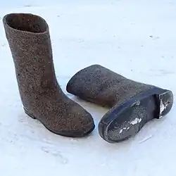 During the 18th and 19th centuries gentlemen's headwear made from beaver felt were popular.[27][32][33] In the early part of the 20th century, cloth felt hats, such as fedoras, trilbies[34] and homburgs,[35] were worn by many men in the western world. Felt is often used in footwear as boot liners, with the Russian valenki being an example.[36][37]
