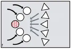 FCC proponents argue that menstruation became a key problem because it potentially creates conflicts between the females and conflicts between males. Menstruation has little social impact among chimpanzees or bonobos, since visible oestrus swellings are the focus of male attention. But once external signs of ovulation had been phased out in the human lineage, according to FCC, menstruation became salient as the one remaining external promise of fertility. Potentially, dominant males might exploit such information, repeatedly targeting newly cycling females at the expense of pregnant or nursing mothers (figure e). Those who might lose male investment needed to take control. According to FCC, older and more experienced females did this by initiating newly cycling females into their kin-based coalitions (figures f, g). Red ochre pigments allowed women to take conscious control over their signals, resisting any dominant male strategy of picking and choosing between them on biological grounds.[27][28] It is argued that because precise, sustained menstrual synchrony is difficult to achieve, painting up with blood-red pigments was the next best thing, enabling the benefits of artificial, ritually constructed synchrony.[29]