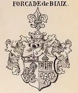 Heraldic symbolism: The lion symbolizes courage; the eradicated oak tree symbolizes strength and endurance; the towers are symbols of defense and of individual fortitude; the mullets (5-star) symbolizes divine quality bestowed by god; the rose is a symbol of hope and joy; the fleur-de-lis is the floral emblem of France; the coronet is a symbol of victory, sovereignty and empire. A count's coronet to demonstrate rank and because the family originally served the counts of Foix and Béarn during the English Wars in the Middle Ages.