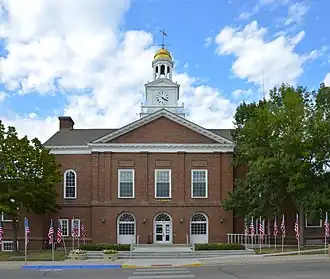 Ingemann used Independence Hall in Philadelphia as his inspiration for the new building.[3] It features a two-story central block that is flanked by single-story symmetrical wings. A clock tower rises from the center of the central block. The basement on the north side is exposed given the slope of the property toward the river. When it was completed in 1928, the building housed the city offices, with the fire department and the city garage on the lower level. It was listed on the National Register of Historic Places in 1984.[1]