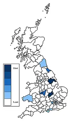 Statistically, it is a very uncommon surname in Great Britain. In the 1881 census there are 83 Ferrers recorded, with an average of 3 occurrences per million surnames. Also in 1881, it was ranked as the 19,011th most common surname. In the 1996 electoral register 185 Ferrers were recorded, with an average of 5 occurrences per million surnames, while it was ranked as the 17,724th most common surname.[19] Distribution: in 1881 the Northampton postal area had the highest rate of occurrences of Ferrer per million surnames. By 1998 the highest postal area per million was East Central London.[19]