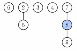 Figure 4. Fibonacci heap from Figure 1 after decreasing key of node 9 to 0.