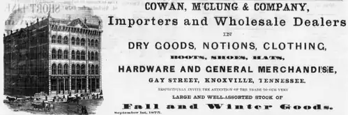 Cowan, McClung and Company was formed in 1858 by the merger of two Knoxville wholesalers– Cowan and Dickinson, operated by James Cowan (1801–1871) and Perez Dickinson (1813–1901), and McClung, Wallace and Company, operated by the McClung family.[1][3] Cowan was a nephew of Nathaniel and Samuel Cowan, who had opened Knoxville's first general store in 1792,[4] and was a stepson of Thomas Humes, who had established the Lamar House Hotel in 1816. In 1820, Cowan opened his first store, located at the corner of Gay and Main, using money he had borrowed from his mother.[3]