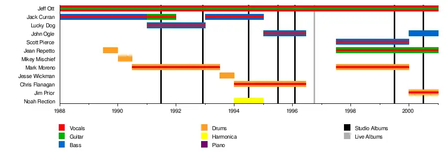 | Past members | Jeff Ott Jack Curran Mikey Mischief Mark Moreno Jean Repetto Lucky Dog Chris Flanagan John Ogle Jesse Wickman Joe Cable John Quintos Scott Pierce Jim Prior Lisa D. Vanessa Bain |