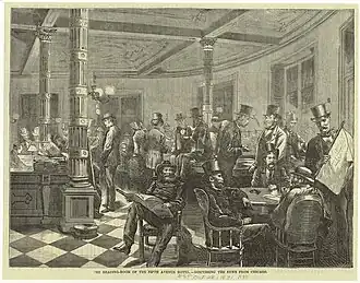 President Ulysses S. Grant's 1868 presidential campaign began at a dinner party in the hotel, and he and his cabinet once held an official session there.[13] On September 20, 1873, Grant came to New York in response to the start of the financial Panic of 1873, and held a series of meetings at the hotel the next day with financiers, brokers, bankers and railroad executive, all wanting Grant to take steps to stabilize the economy, but Grant lacked the tools which later presidents would have to deal with the economy, as there was no central bank, no Federal Reserve system, to take necessary measures. After the presidential campaign of 1880, in which Grant campaigned for James Garfield, he and his wife Julia moved into the hotel for the winter.[14]