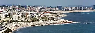Figueira da Foz (Portuguese pronunciation: [fiˈɣɐjɾɐ ðɐ ˈfɔʃ] ⓘ), officially Figueira da Foz City (Portuguese: Cidade da Figueira da Foz), often called simply Figueira for short, is a city and a municipality in the Coimbra District, in Portugal. Practically at the midpoint of the Iberian Peninsula's Atlantic coast, it is located at the mouth of the Mondego River, 40 km (25 mi) west of Coimbra and sheltered by hills (Serra da Boa Viagem), sharing about the same latitude with Philadelphia, Baku and Beijing. The population of the municipality in 2011 was 62,125,[1] in an area of 379.05 km2 (146.35 sq mi).[2] The city of Figueira da Foz proper has a population of 46,600. It is the second largest city in the district of Coimbra.