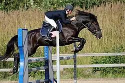 The riding horse section Finnhorse is a capable and reliable mount. It lacks some traits required for competing at the highest levels of international riding sports,[61] but its combination of size and good temperament makes it suitable for both adults and children.[8][62] To qualify for the riding section, a horse must carry itself well, and have a long neck, small head, sloping shoulder and well-defined withers. The body must not be too long.[39] The universal Finnhorse breeding goals have made the breed of a lighter build, with longer neck, better gaits and fewer faults in conformation, allowing modern riding-type Finnhorses to work more easily on the bit. Even the temperament of the riding section animals appears to have become more lively.[63] To pass the studbook evaluation, a riding type horse must either have placed in a Grade IV dressage or combined driving competition, or pass a dressage test; must pass a jumping evaluation and a ridability test, and possess clean gaits. Mares may be qualified solely on grounds of a ridability test and a movement evaluation.[40]