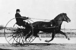 One of the Finnhorse founding sires, Kirppu tt 710, pulling an early sulky at full speed, c. 1890