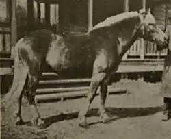 Because of the vigorous colour breeding for chestnut in the early 20th century, combined with a genetic bottleneck resulting from the low number of Finnhorses that existed in the 1980s, colours such as grey and cream dilutions were preserved only by a few minor breeders. In the 1980s there were fewer than ten grey and palomino Finnhorses combined.[9] All Finnhorse carriers of the cream gene today descend from a single maternal line, founded by the palomino mare Voikko (literally, "Palomino") who lived in the 1920s.[20] While both cream dilution and black are rare, there are some known smoky blacks in the breed, the first of which was a filly foaled in 2009, identified as smoky black and confirmed as such by a DNA test in 2010.[21][22][23] The filly is considered "if not the first ever, at least the first in a long long time."[21] In April 2010, a filly appearing to be a double cream dilute was born, sired by a buckskin and out of a palomino. She was blue-eyed and had "pink skin and very pale coat", and was officially recognised as a double cream dilute.[6][24][25][26][27][28]