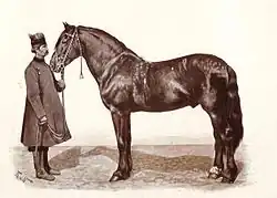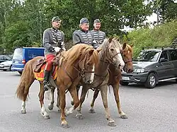 Russian Orlov trotters and Don horses also influenced the Finnhorse population in the first half the 19th century, improving its size, ridability and refinement.[64][79] The horse type originating in Northern Savonia known as the "Fürstenbergian breed," bred by the engineer Fürstenberg at the beginning of the 19th century, was a crossbreed between the Finnish horses and Orlov trotters.[64][79] The influence of Don horses was seen as late as in the 1920s and 1930s among the black and bay horses used by the Finnish cavalry – the dragoons of Nyland had two full squadrons of these colours.[64]