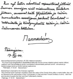 Marshal of Finland Carl Gustaf Emil Mannerheim's farewell to the Estonian regiment JR 200, 17 July 1944