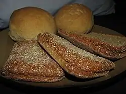 Five types of Finnish rye bread (top to bottom/left to right): limppu, reikäleipä, a loaf, commercial pre-halved rye bread, and hapankorppu | |