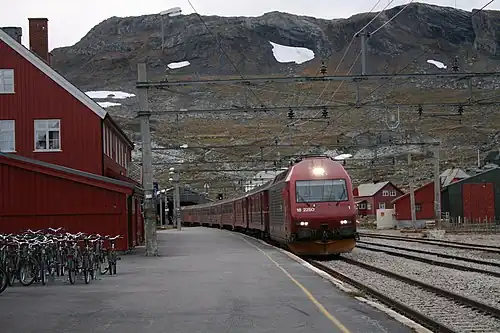 Finse Station (Norwegian: Finse stasjon) is located in the mountain village of Finse in the municipality of Ulvik in Vestland county, Norway. The station is served by up to seven daily (peak days only) express trains in each direction, normally three per day and one overnight trains, all operated by Vy Tog.[1] The Finse Tunnel begins just west of the village and the Rallarvegen goes through the village.