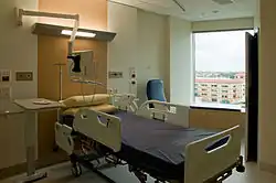 The hospital opened progressively over several months between October 2014 and March 2015. The opening was delayed by six months to October 2014 due to issues with readiness of new integrated state-of-the-art information technology clinical systems.[9] The Fiona Stanley facilities incorporate technological innovations such as automated guided vehicles that deliver catering towards, and mobile computer workstations on wheels to assist staff with dispensing of patient medications while accessing required clinical applications.[10] Most bedrooms also have new multi-purpose, wall-mounted swing-arm, bedside patient entertainment systems incorporating touchscreens and keyboards that patients can use for ordering meals, making phone calls, watching TV or movies/games, which can also be redirected for use by clinical staff via a swipe card for functions such as updating patient records and reviewing diagnostic imaging such as X-rays.[11]