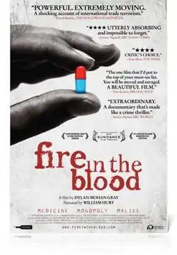 Fire in the Blood is a 2013 documentary film by Dylan Mohan Gray depicting what it claims is the intentional obstruction of access to low-cost antiretroviral drugs used in the treatment of HIV/AIDS to people in Africa and other parts of the global south, driven by multinational pharmaceutical companies holding patent monopolies and various Western governments (above all those of the United States, European Union and Switzerland) consistently supporting these companies. The film claims that the battle against what it refers to as a "genocidal blockade," which it estimates to have resulted in no less than ten to twelve million completely unnecessary deaths, was fought and (at least temporarily) won.